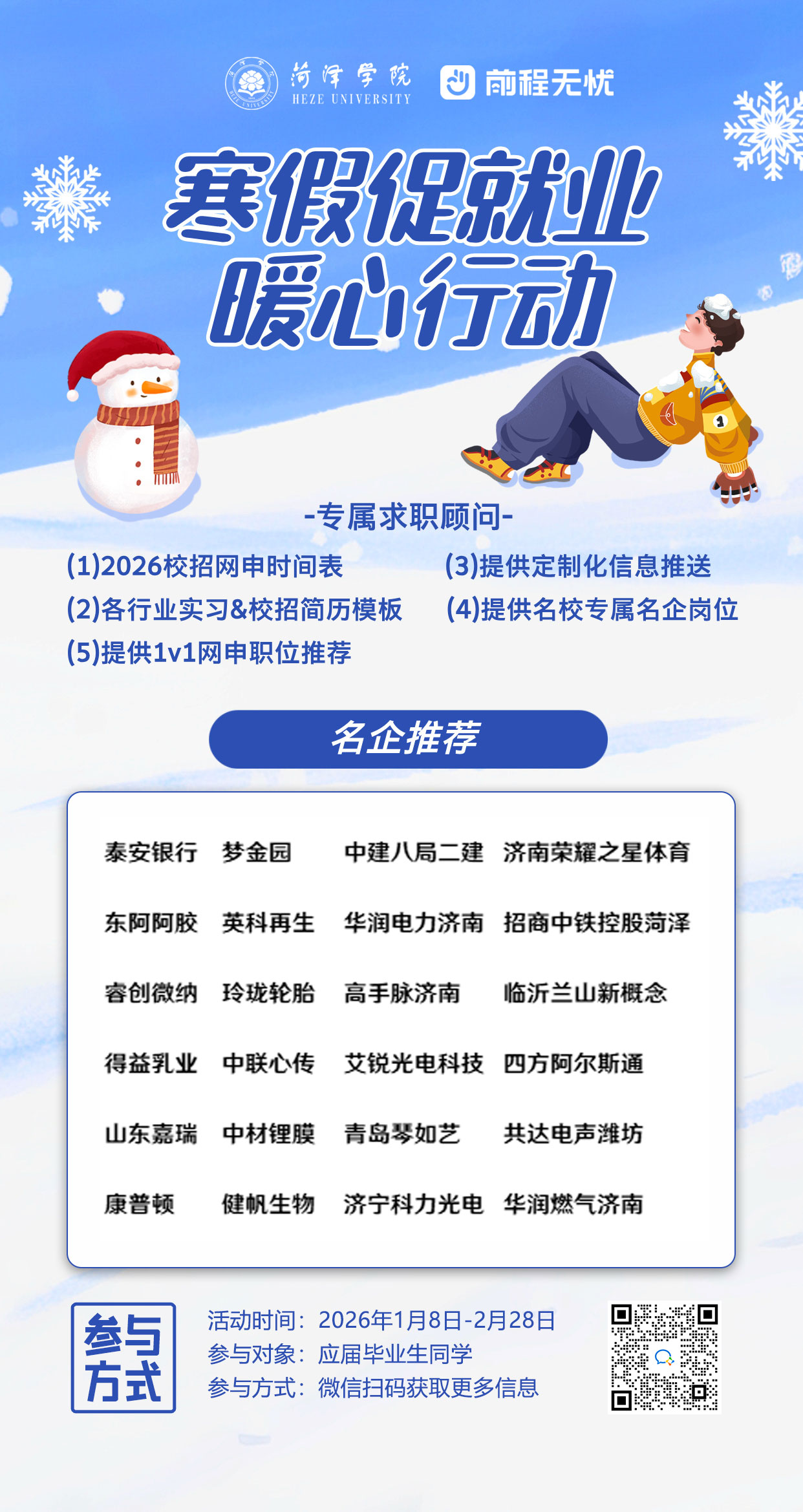 寒假如约而至,梦想步履不停。当冬日的暖阳洒满校园,我们也迎来了这场满载关怀与期许的“寒假促就业暖心活动”。毕业的钟声虽未敲响,但求职的征途已然开启 —— 我们深知,每一位怀揣理想的学子,都渴望在寒冬中握到一束照亮前路的光;每一份跃动的简历背后,都藏着对未来的无限憧憬。